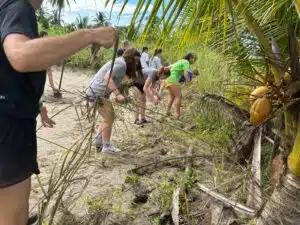 Had our first night patrol last night. Incredible. First group came across a turtle coming up the beach. Stella helped to record all of the data in the Turtle Trax journal, and Cici was the one catching the 94 eggs and placing them in a bag held by Allison to take back to the hatchery. The second group saw another turtle heading towards the ocean, but no nest was found. As an entire group, however, we came across a third turtle that had just made a nest. After she left, Sophie, Sam, and Susannah helped to retrieve the 99 eggs from the nest. Then a fourth turtle was spotted but also no nest.
